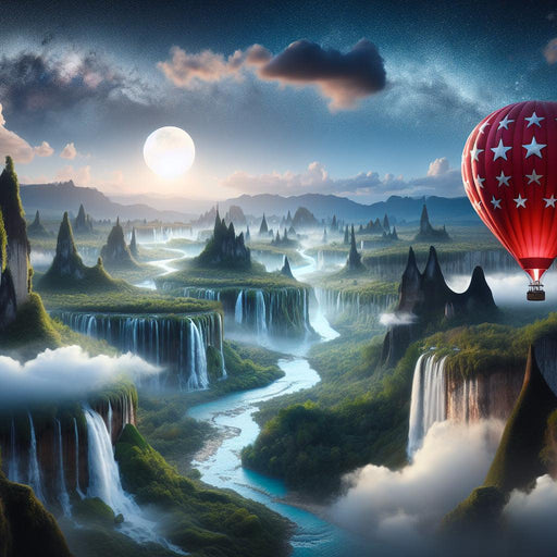 Afficher tous les détailsPapier peint montgolfière | Cascades et ballon rouge avec des étoiles au clair de lune