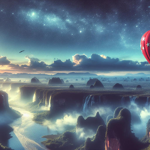 Afficher tous les détailsPapier peint montgolfière | Ballon rouge à étoiles dans les cascades majestueuses