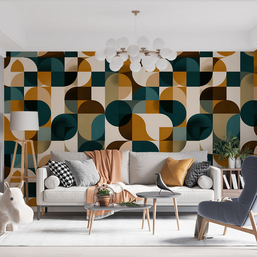 Ce papier peint présente une composition harmonieuse de formes géométriques dans des tons pastels. Les cercles, demi-cercles et rectangles s'entrel...