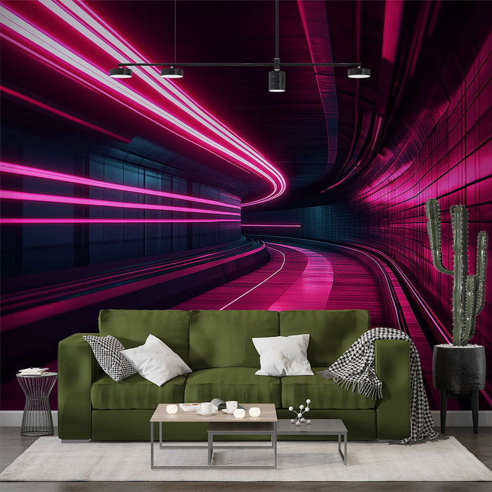 Ce papier peint captivant illustre un tunnel futuriste, illuminé par des bandes de lumières néon roses qui créent une atmosphère dynamique et énergique. Les lignes courbées et les reflets brillants ajoutent une profondeur visuelle impressionnante, invitant à l'imagination et à l'aventure.