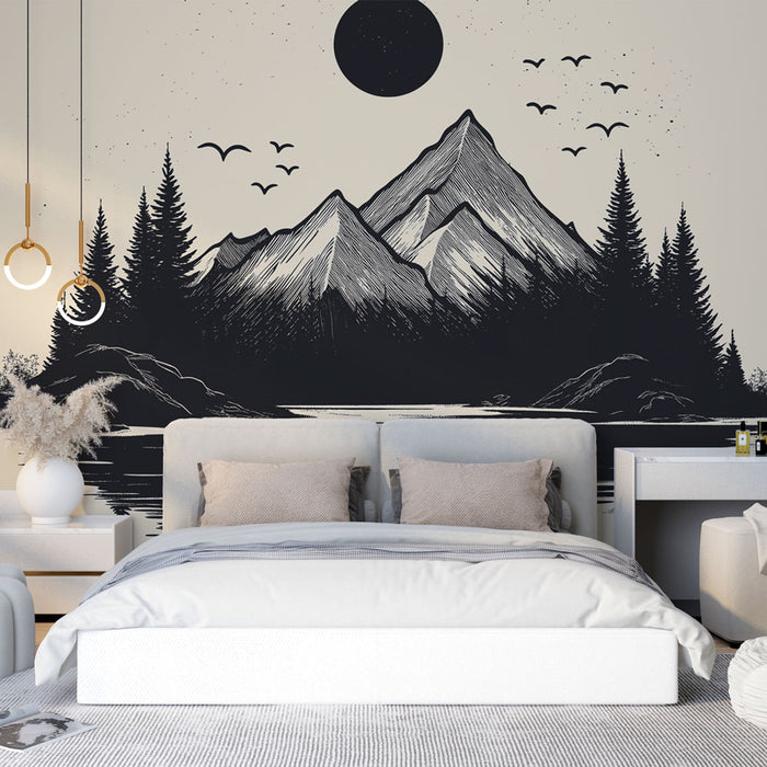 Découvrez notre papier peint captivant représentant des montagnes majestueuses bordées d'une forêt dense, sous l'ombre d'un soleil noiroyant. Le motif illustratif crée une ambiance naturellement sereine, parfaite pour élever l'esthétique de votre intérieur.
