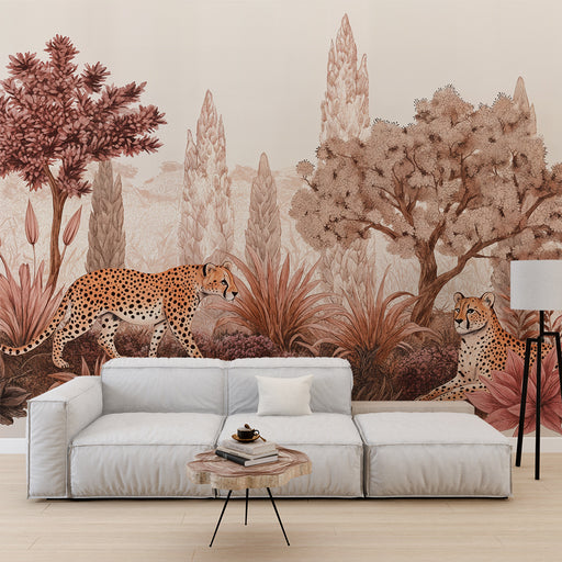 Afficher tous les détailsCe papier peint illustre une scène de safari captivante, mettant en avant un éléphant, une girafe, un léopard et un zèbre, entourés de palmiers dél...