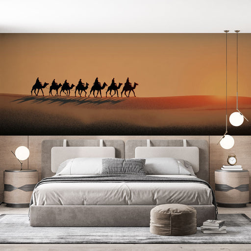 Afficher tous les détailsDécouvrez notre papier peint désert illustrant une magnifique caravane de chameaux au coucher du soleil. Les silhouettes noires des chameaux se dét...
