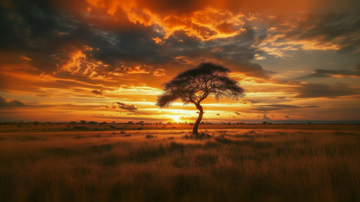 LePapierPeintCe papier peint captivant représente une scène de safari au crépuscule. Une girafe majestueuse se tient debout parmi les arbres d'acacia, tandis qu...