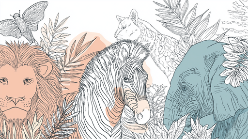 LepapierpeintCe papier peint joyeux présente un motif coloré d'animaux de la savane, comprenant des éléphants, des lions et des tigres entourés de feuillages ex...