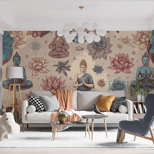 Créa'VCe papier peint méditatif présente une harmonie entre les images de Bouddha en méditation et les motifs de fleurs de lotus, créant une ambiance apa...