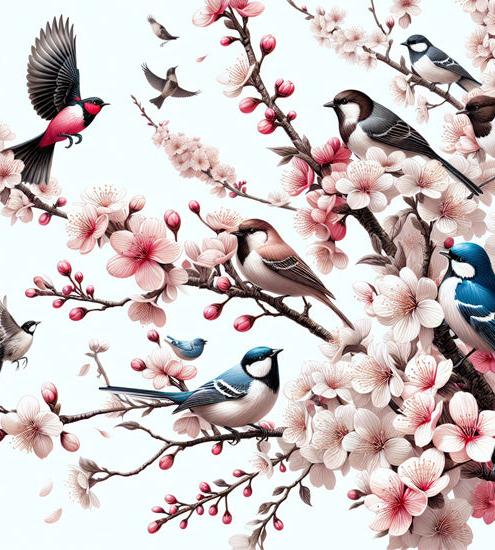 Afficher tous les détailsPapier peint oiseaux | Cerisier japonais multicolore avec rouges gorges