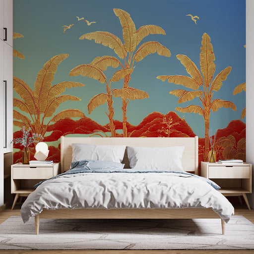 Découvrez notre papier peint tropical avec un design captivant de palmiers et de collines baignés par une lumière où se mêlent des teintes dorées e...