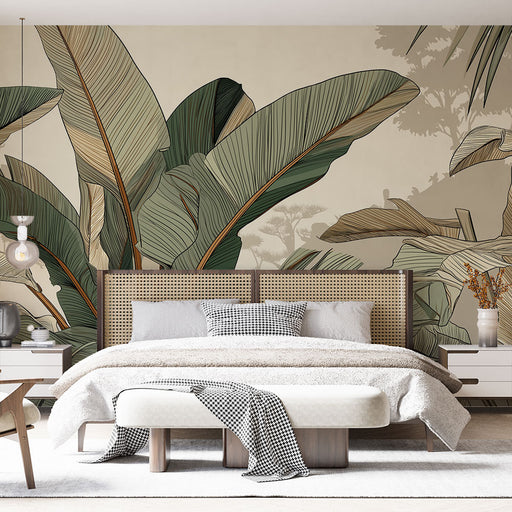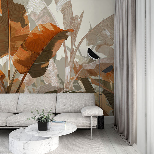 Papier peint feuillage tropical | Feuilles de bananier aux teintes chaudes et esquisses délicates