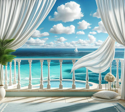 Afficher tous les détailsPapier peint trompe l'œil | Rideaux blancs et balcon donnant sur la mer et un voilier