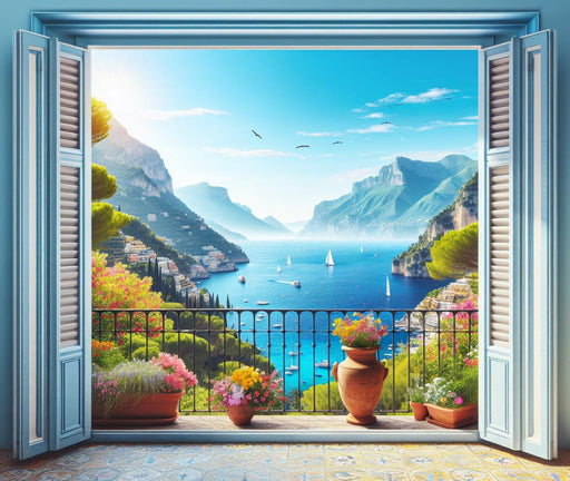 LePapierPeintCe Papier peint trompe l’œil ouvre une fenêtre sur la Méditerranée, transformant votre pièce en un balcon surplombant une mer azur parsemée de voil...