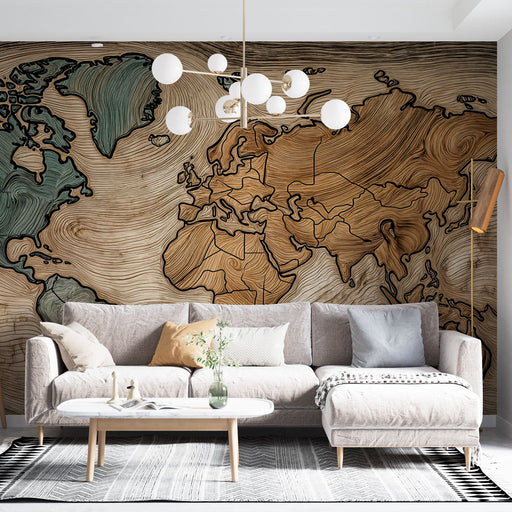 Papier peint carte du monde | Contours artistiques en tons boisés