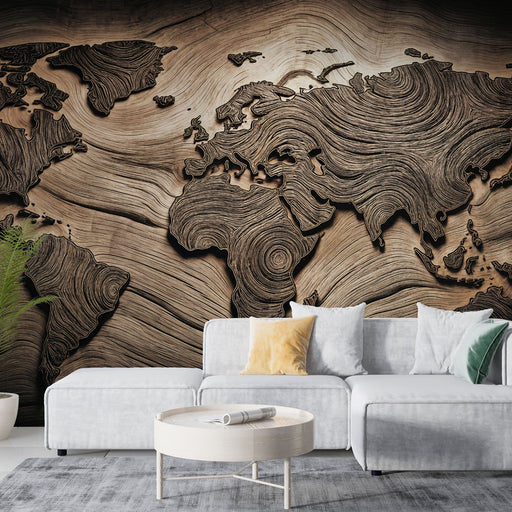 Transformez votre espace avec notre papier peint carte du monde au design en bois sculpté. Ce motif élégant et distingué est idéal pour créer une a...