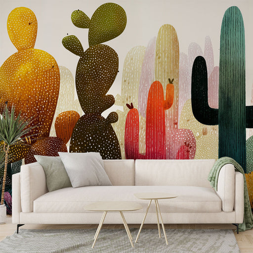 Un mur d'accent orné de grands cactus peut devenir le point central de votre espace de vie, créant une ambiance chaleureuse et accueillante. Le papier peint panoramique cactus sublime particulièrement les grands espaces ouverts.