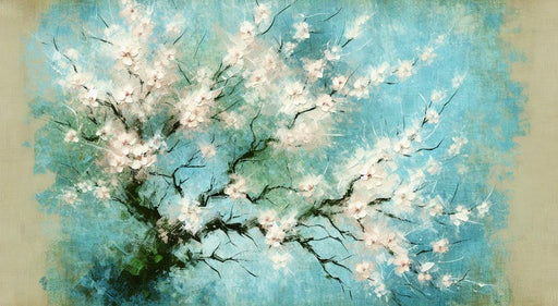 Afficher tous les détailsPapier peint cerisier japonais | Style peinture à l'huile bleue avec des fleurs blanches