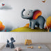 Ce papier peint éléphant est parfait pour apporter une touche ludique et colorée à la chambre d'un enfant. L'image montre un éléphant souriant avec des oreilles aux teintes vives debout sur une colline verdoyante. Les arbres aux feuilles orange et les oiseaux colorés ajoutent une dimension vivante et chaleureuse au décor.