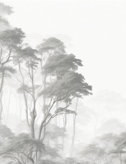 Ce papier peint présente une forêt dense enveloppée de brume, créant une atmosphère mystérieuse et apaisante. Les nuances de vert et de gris se mêl...