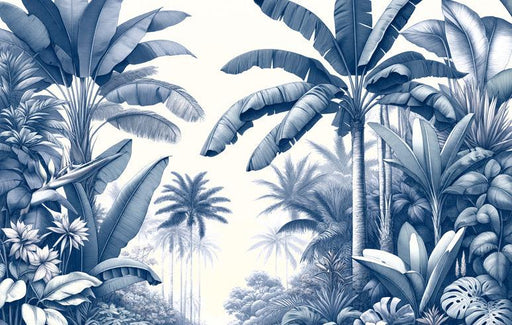 LePapierPeintPlongez dans un paradis tropical avec notre papier peint jungle bleu canard Palmiers et bananiers fond blanc. Les nuances envoûtantes de bleu profo...
