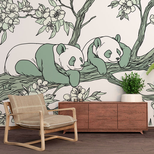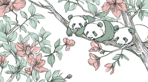 LepapierpeintCe papier peint présente un adorable motif illustrant deux pandas paisiblement installés sur une branche d'arbre, entourés de fleurs délicates et d...