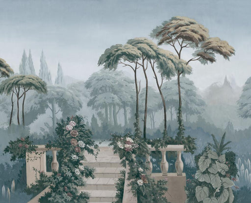 Afficher tous les détailsPapier peint trompe l'œil | Allée dans un jardin fleurie avec statues antiques