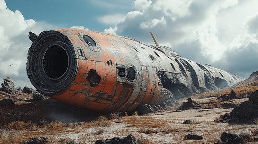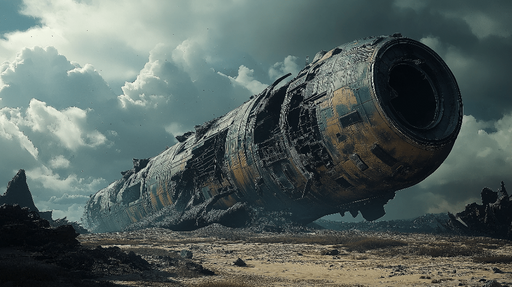 LepapierpeintCe papier peint captivant représente un vaisseau spatial aux couleurs rougeâtres, échoué sur un terrain aride et rocheux. L'illustration évoque une...