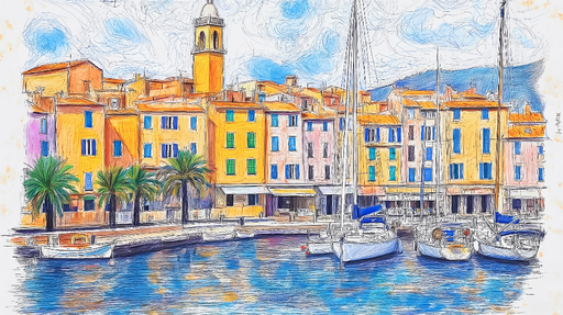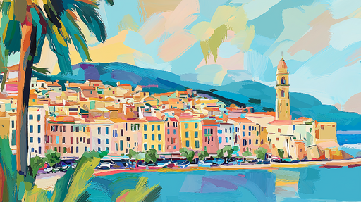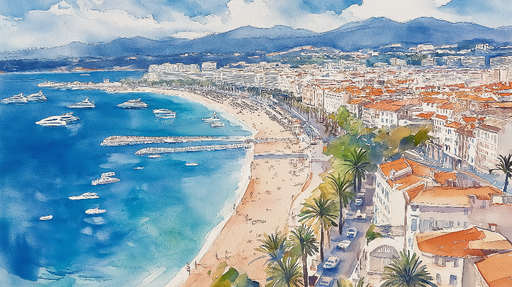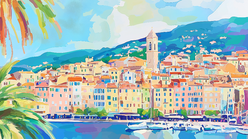 LepapierpeintPlongez dans l'atmosphère ensoleillée de la Côte d'Azur avec notre papier peint illustrant une magnifique vue panoramique à l'aquarelle. Ce design ...