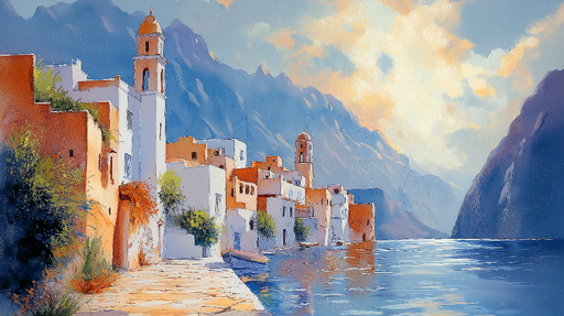 LepapierpeintCette peinture captivante représente un village méditerranéen baigné de lumière, avec des maisons aux façades crémeuses et des toits en tuiles roug...
