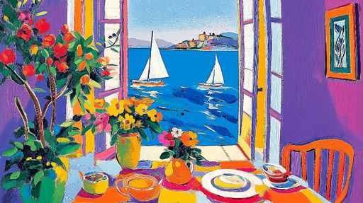 LepapierpeintCe papier peint captivant offre une vue imprenable sur la mer, ornée de voiliers, le tout encadré par des fenêtres aux couleurs vives. Les teintes ...