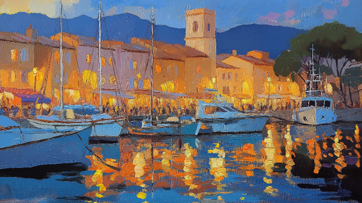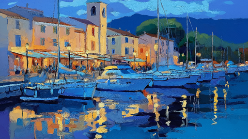LepapierpeintCe papier peint présente une scène nocturne vibrante d'un port méditerranéen, avec des bateaux élégants amarrés le long des quais, sous un ciel ble...