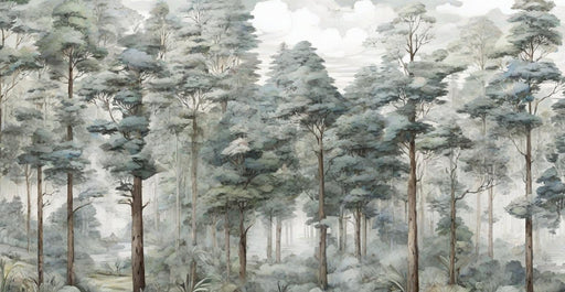 Papier peint forêt brumeuse | Éléments de pins et feuillus dans une ambiance apaisante