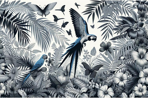 Notre papier peint exclusif met en avant un motif ludique de perroquets élégamment intégrés dans un feuillage tropical luxuriant. Les oiseaux aux couleurs éclatantes et leur posture dynamique apportent une touche exotique à votre intérieur, créant une atmosphère joyeuse et vivante.