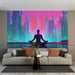 Apportez une touche moderne et zen à votre espace avec notre papier peint futuriste représentant une silhouette en méditation au sein d'une ville aux couleurs néon éclatantes. Ce design captivant, mêlant teintes roses et bleues, s'intègre parfaitement dans un intérieur contemporain.