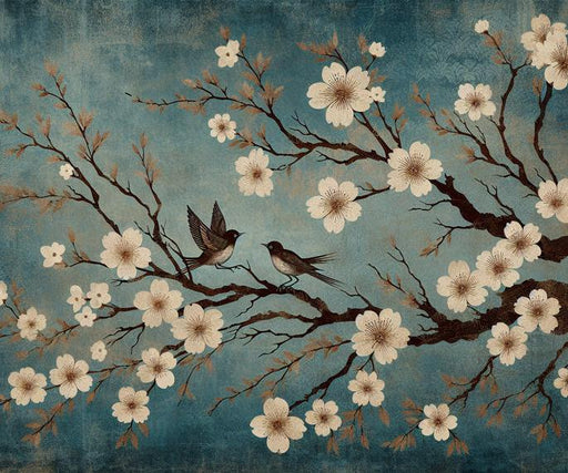 Afficher tous les détailsPapier peint cerisier japonais | Fond bleu vieillit style peinture à l'huile avec oiseaux et fleurs blanches