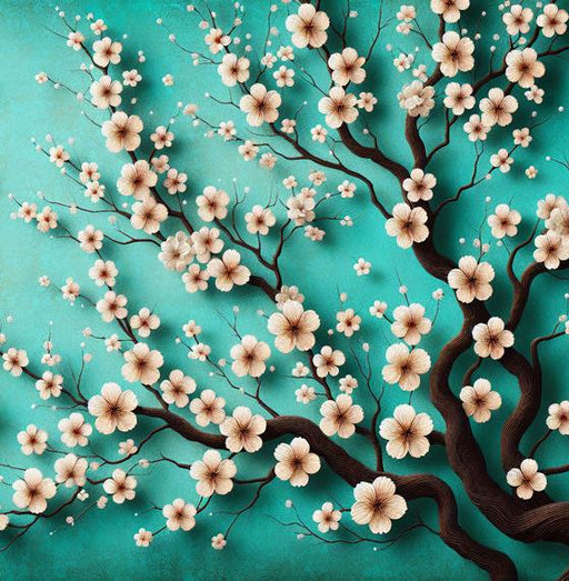 LePapierPeintCe Papier peint cerisier japonais est une invitation à la sérénité, évoquant la beauté délicate d'un jardin oriental. Sur un fond turquoise apaisan...