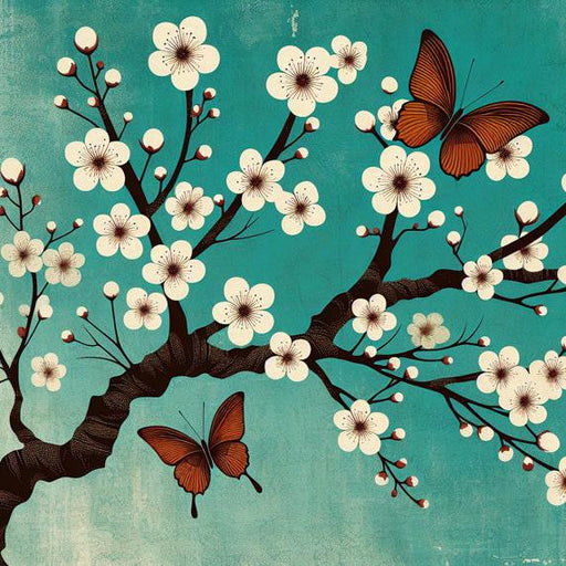 LepapierpeintFleurs de Cerisier et Calligraphie Ancienne Ce papier peint évoque la douceur de l'Orient avec ses délicates branches de cerisier en fleurs, peinte...