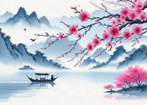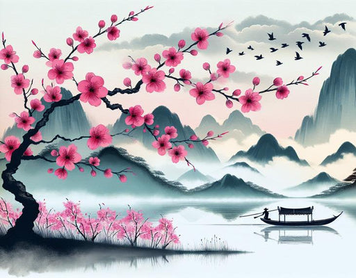 Afficher tous les détailsPapier peint cerisier japonais zen | Pirogue sur lac calme et relief montagneux