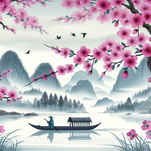 LePapierPeintCe Papier peint cerisier japonais transporte dans un paysage de rêve, inspiré des classiques peintures de paysage chinoises. Les montagnes ondulant...