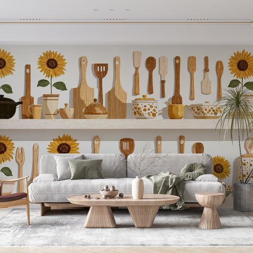 Afficher tous les détailsPapier peint cuisine tournesol | Design rustique avec ustensiles en bois