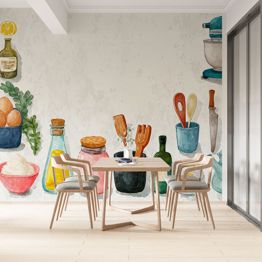 Créa'VCe papier peint cuisine vintage présente une illustration artistique d'ingrédients culinaires et d'ustensiles de cuisine, créant une ambiance chale...