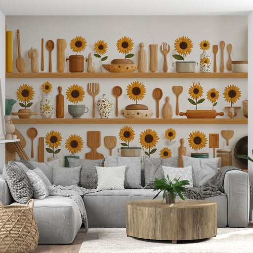 Afficher tous les dĂ©tailsPapier peint cuisine | ĂtagĂšres dĂ©coratives avec tournesols et ustensiles en bois