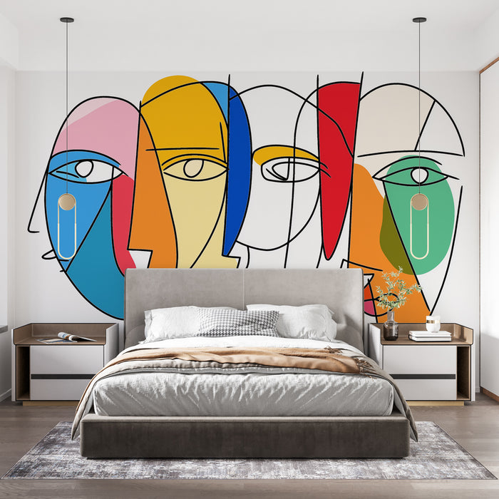 Ce papier peint abstrait aux visages multicolores capture un mélange audacieux de modernisme et d'expressionnisme. Les traits simplifiés des visages se mêlent dans une harmonie de couleurs vives, comprenant du bleu, du rose, du jaune, et plus encore, sur un fond épuré qui met en valeur chaque forme.
