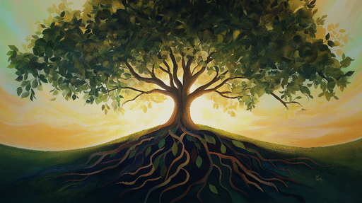 Ce papier peint met en avant une illustration artistique d'un arbre majestueux, symbolisant la force et la vitalité. Les nuances de vert et de brun rappellent la nature, tandis que le fond lumineux évoque la chaleur du soleil et une atmosphère paisible.