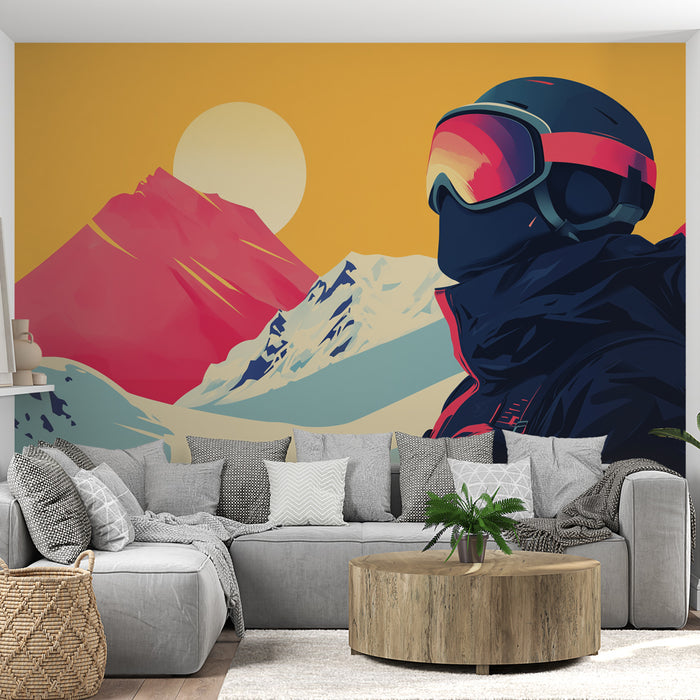 Ce papier peint présente une scène de montagne éblouissante où un skieur est visible, admirant un paysage hivernal dynamique. Les teintes vives de jaune et de rose du ciel contrastent avec le blanc pur des neiges et les reflets de lumière qui confèrent à l'ensemble une atmosphère chaleureuse et énergique.